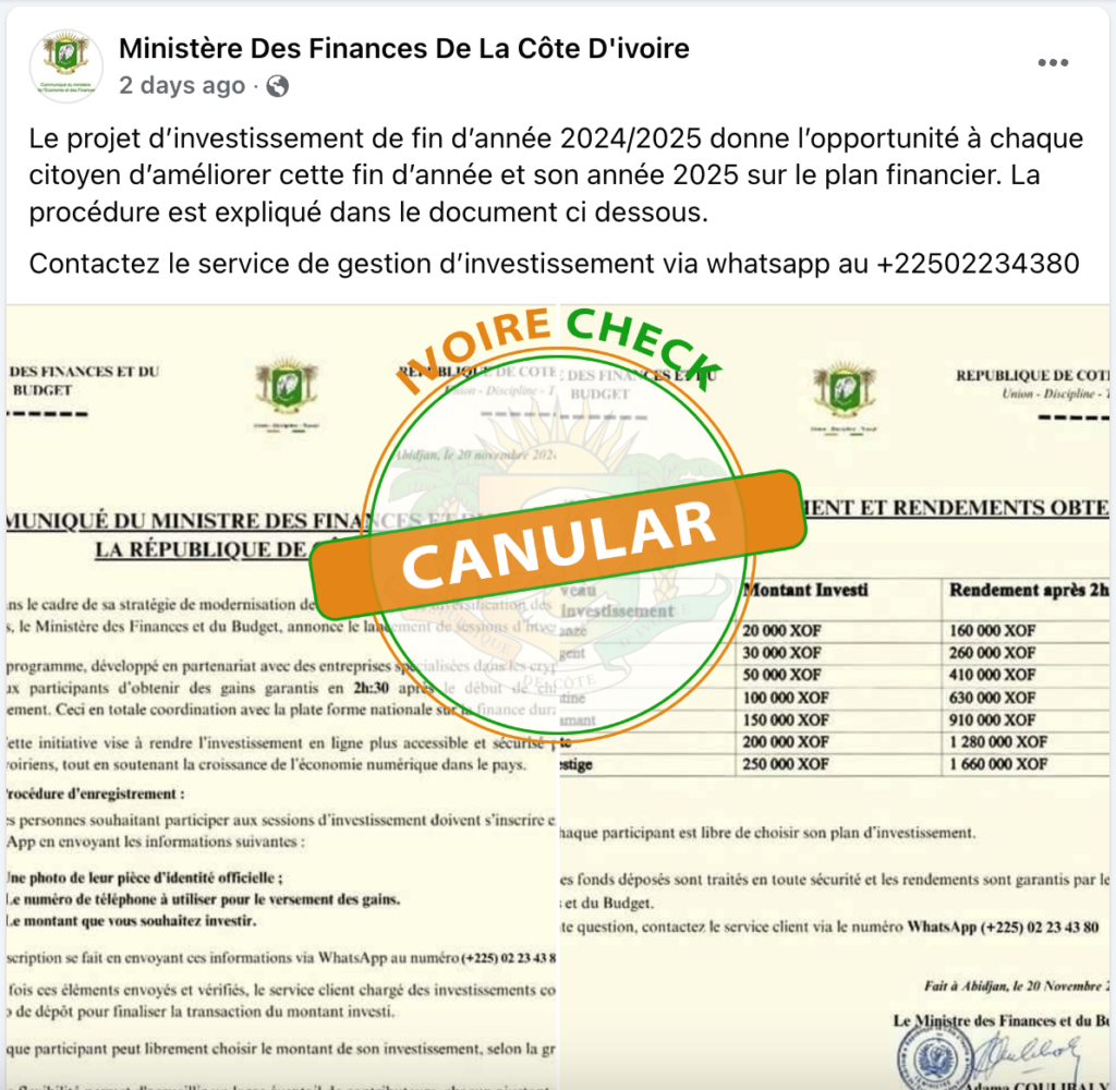 CANULAR : Cette information ne provient pas du ministère des Finances et du budget ivoirien