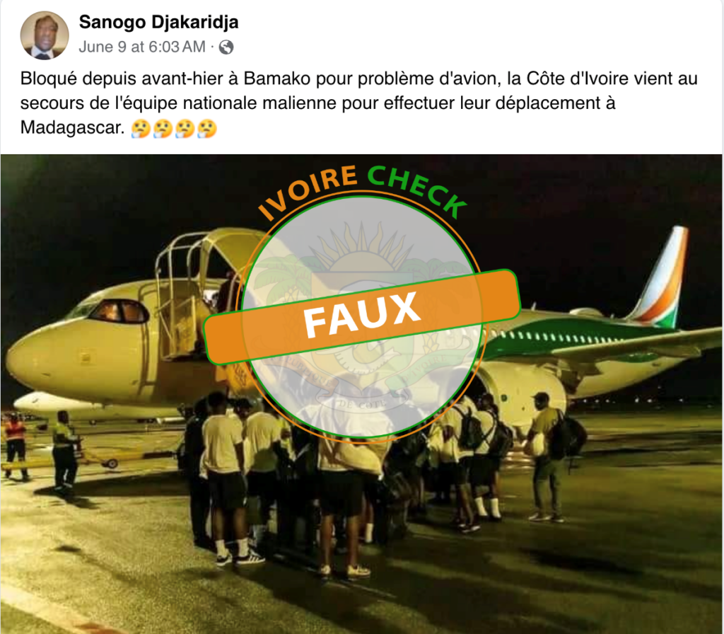 FAUX : Cette photo ne montre pas les joueurs de l’équipe du Mali bloqués et secourus par la Côte d’Ivoire lors de leur départ pour Madagascar