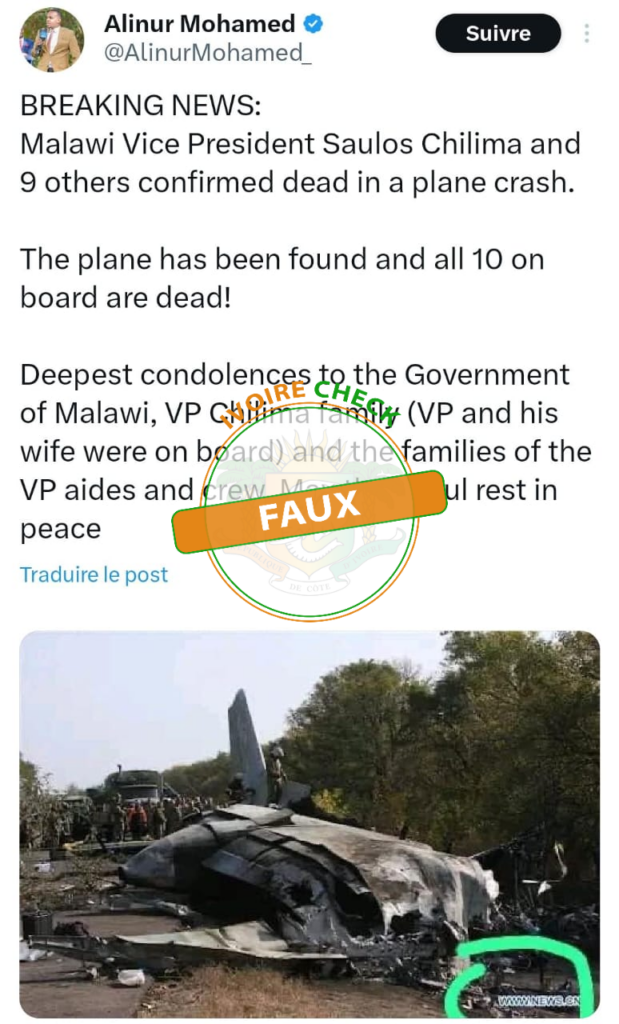 FAUX : Cette photo ne montre pas la scène du crash de l’avion du Vice-Président du Malawi
