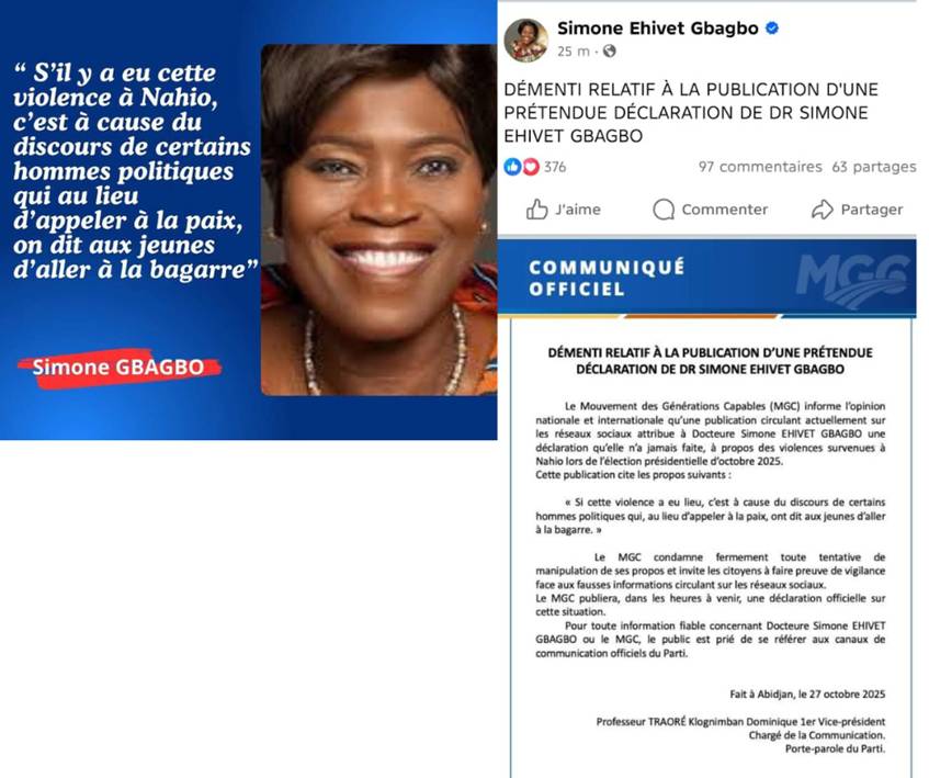 Un autre exemple est celui de la fausse déclaration attribuée au Mouvement des Générations Capables (MGC) dirigé par Simone Gbagbo. Ce document factice, partagé plusieurs fois sur les réseaux sociaux, le 27 octobre 2025, présente une image de l’ancienne première dame Simone Gbagbo à côté d’une déclaration sur les violences survenues le 25 octobre 2025 à Nahio, près d’Issia (centre-ouest du pays) dans la région du Haut-Sassandra : « S’il y a eu cette violence, c’est à cause du discours de certains hommes politiques qui au lieu d’appeler à la paix on dit aux jeunes d’aller à la bagarre ».