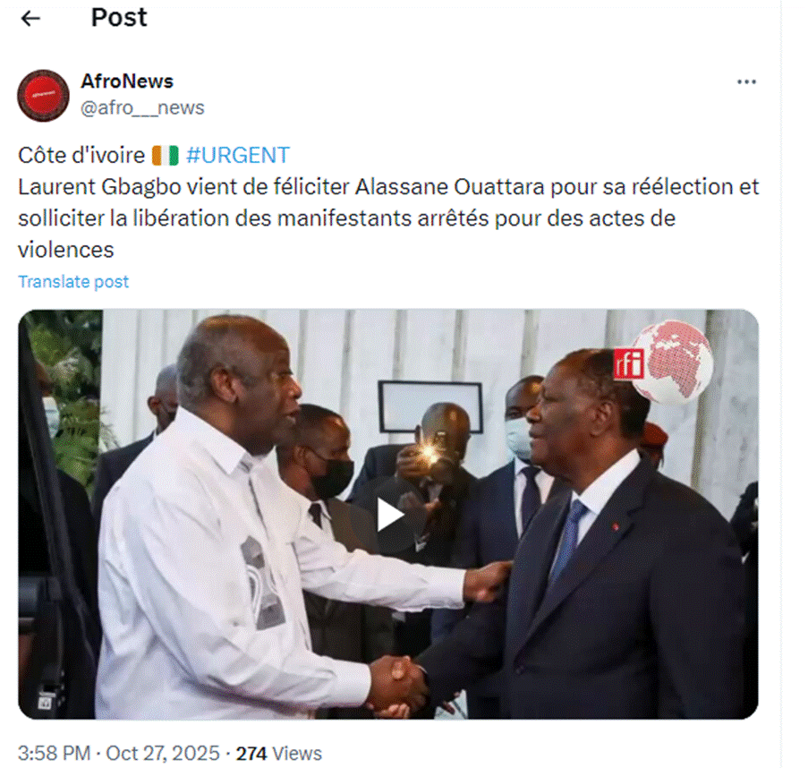 Quelques heures après que la Commission électorale indépendante (CEI) a proclamé les résultats provisoires de l’élection présidentielle du 25 octobre 2025, donnant vainqueur avec 89,77 % des voix le président sortant Alassane Ouattara, un post publié sur X par le compte Afronews affirme que « Laurent Gbagbo vient de féliciter Alassane Ouattara pour sa réélection et solliciter la libération des manifestants arrêtés pour des actes de violences ». Des publications similaires ont ensuite largement circulé sur Facebook (1, 2, 3, 4 , 5 , 6)