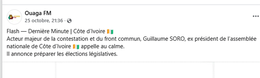 « Flash-Dernière Minute | Côte d’Ivoire Acteur majeur de la contestation et du front commun, Guillaume SORO, ex-président de l’Assemblée nationale de Côte d’Ivoire appelle au calme. Il annonce préparer les élections législatives », peut-on lire dans le communiqué attribué à GPS. Cette publication a également fait l’objet d’un article du média en ligne Connectionivoirienne.net avant d’être supprimé (archivé ici) et partagé par YS YS (archivé ici) et Espiègle (archivé ici), deux pages Facebook ayant respectivement 96 000 et 29 000 abonnés.