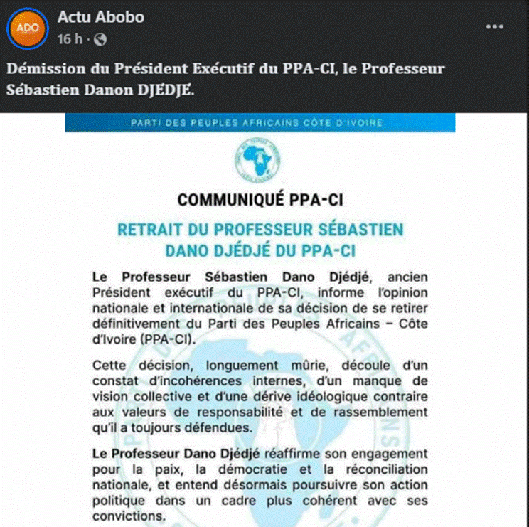 Le même compte Actu Abobo, ayant attribué un faux communiqué au PDCI-RDA, a partagé, le 27 octobre 2025, un communiqué attribué à Sébastien Dano Djédjé, le président exécutif du PPA-CI.