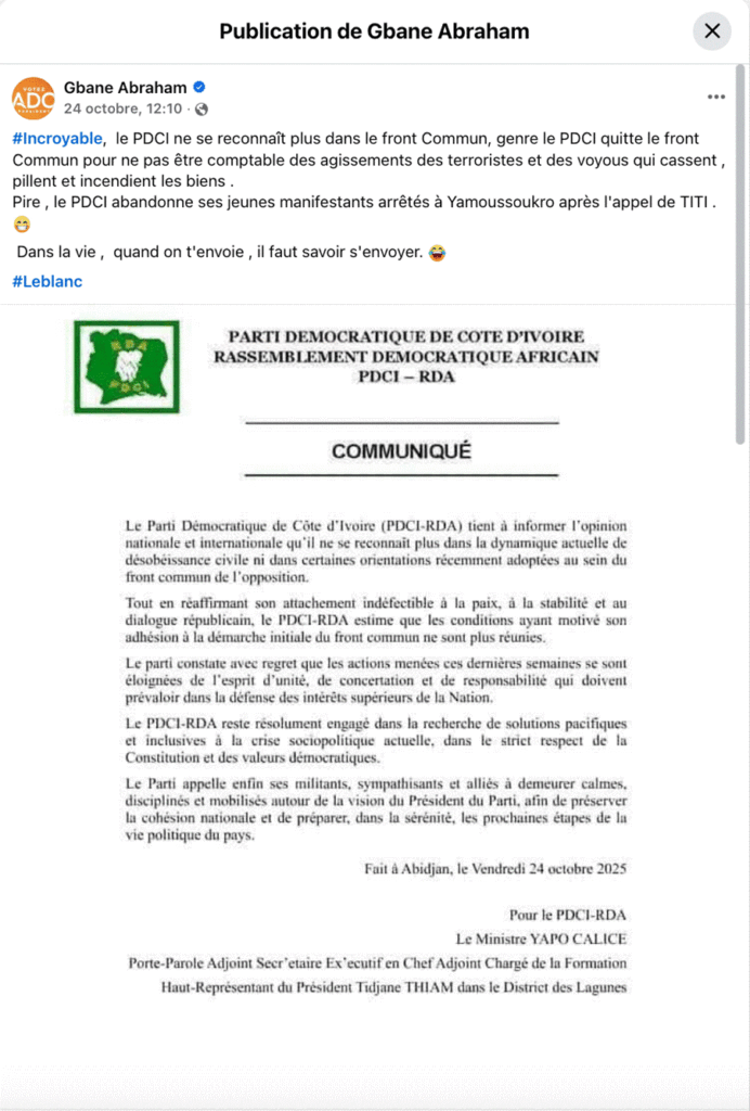 Un autre cas observé est le faux communiqué attribué au Parti démocratique de Côte d’Ivoire- Rassemblement démocratique africain (PDCI-RDA) dirigé par Tidjane Thiam. Publié sur Facebook, le 24 octobre 2025, par le compte Gbane Abraham et partagé plusieurs fois sur les réseaux sociaux.