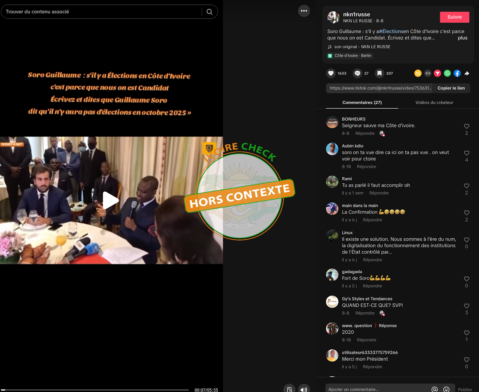 Le 8 août 2025, une vidéo d’une durée de cinq minutes publiée sur TikTok par une page dénommée nkn1russe largement relayée (1,2,3) montre l’ancien président de l’Assemblée Nationale ivoirienne, Guillaume Soro, intervenant lors d’une conférence de presse. Face à un public et en compagnie de Me Affoussiata Bamba Lamine, son avocate, il s’exprimerait sur la tenue des prochaines élections en Côte d’Ivoire en 2025..